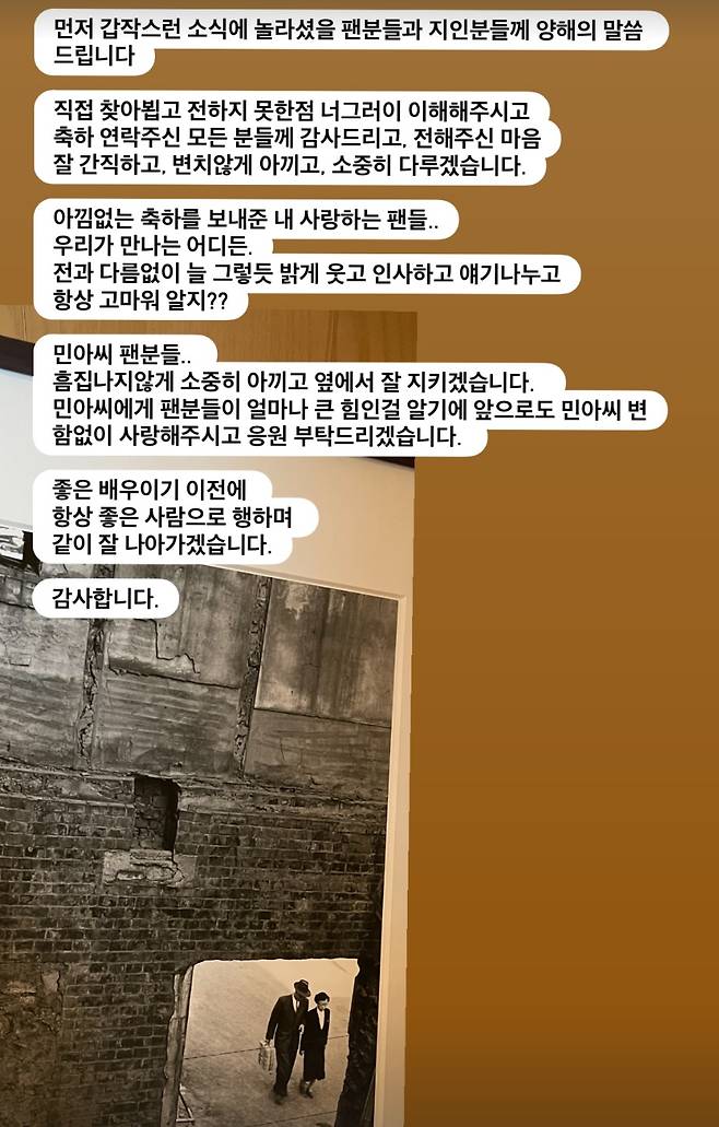 또한 "민아씨 팬분들"이라며 "흠집 나지 않게 소중히 아끼고 옆에서 잘 지키겠다. 민아 씨에게 팬분들이 얼마나 큰 힘인 걸 알기에 앞으로도 민아 씨 변함없이 사랑해 주시고 응원 부탁드리겠다"라고 덧붙였다.