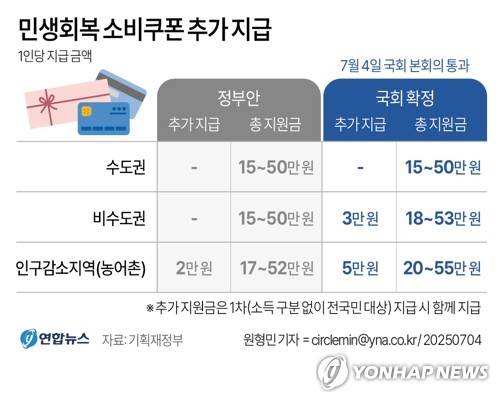 (서울=연합뉴스) 원형민 기자 = 4일 국회 본회를 통과한 추가경정예산(추경)으로 비수도권과 인구감소지역 주민이 민생회복 소비쿠폰을 더 받게 됐다.