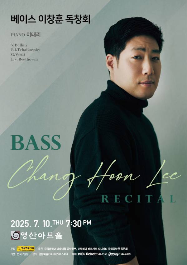 베이스 이창훈의 독주회(포스터)가 오는 10일 서울 영등포구 영산아트홀에서 열린다. 이창훈은 중앙대를 거쳐 이탈리아 베르가모 도니제티 국립음악원 석사를 마쳤다. 그는 부세토 극장을 비롯한 이탈리아의 여러 공연장과 도니제티 페스티벌 등에서 오페라 ‘토스카’ ‘돈 조반니’ ‘리골레토’ 등에 출연했으며, 프랑스 모나코 성당의 크리스마스 콘서트 등의 무대에도 섰다. 귀국 이후 국내 남성 합창단인 브라보체 단원으로 활동하는 등 전문 연주자로서 무대에 서는 한편 후학 양성에 나서고 있다. 피아니스트 이태리와 함께하는 독주회에서는 벨리니의 연가곡 ‘3개의 아리에타’와 오페라 ‘몽유병의 여인’ 속 아리아, 베르디의 가곡 ‘쓸쓸한 방에서’, 오페라 ‘맥베스’ ‘나부코’ 속 아리아 등을 들려준다. 문의 영음예술기획(02-581-5404)