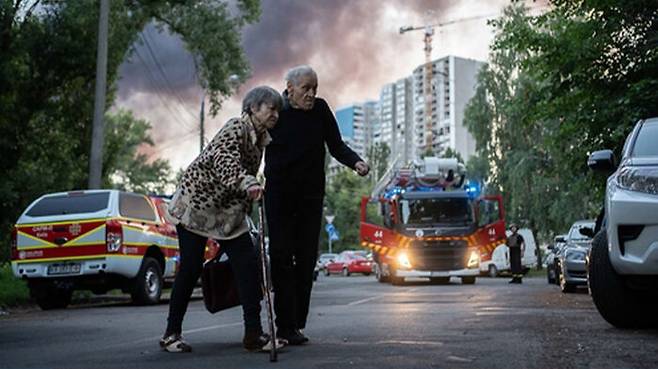 ▲ 3∼4일 사이 러시아 공습받은 키이우에서 두 노인이 길을 지나는 모습