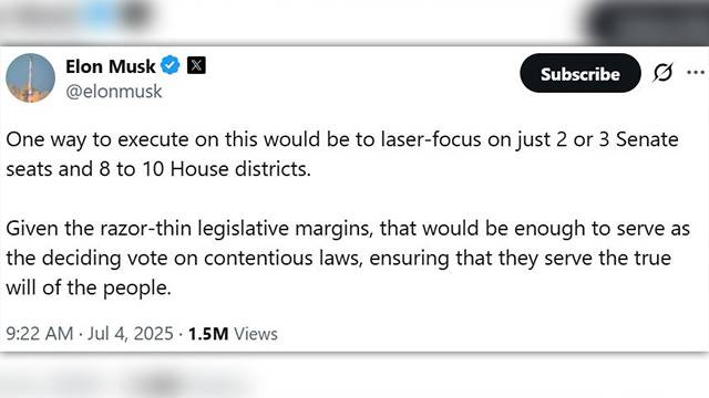 머스크는 이 게시물에서 "독립기념일은 여러분이 양당(일부에서는 단일당이라고도 하는) 체제에서 독립하고 싶은지 묻기에 완벽한 때!"라며 "우리가 아메리카당(America Party)을 창당해야 할까?"라고 물었습니다.