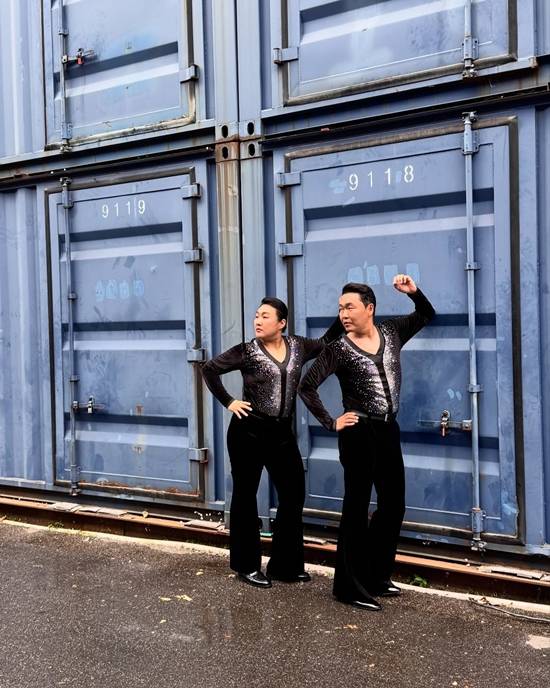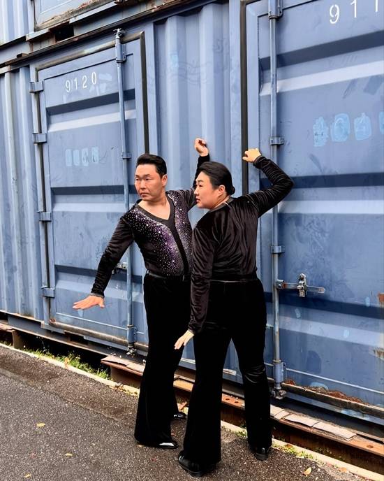 공개된 사진 속 이수지는 싸이와 함께 흡사한 의상을 입고 포즈를 취하고 있다. 반짝이는 블랙 점프수트에 헤어스타일까지 맞춘 모습이 눈길을 끈다.