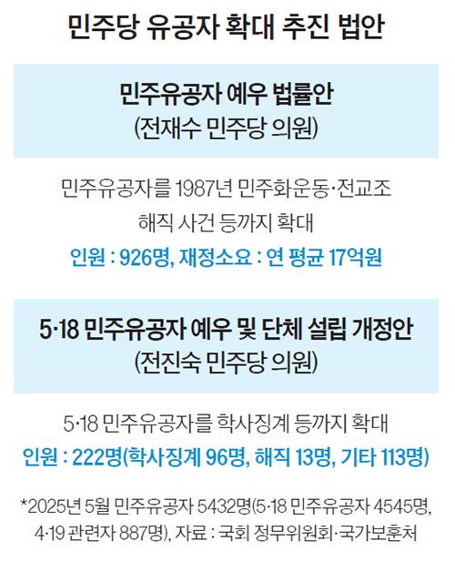 전재수 민주당 의원도 유사한 법안(민주유공자 예우에 관한 법률안)을 냈는데, 1970년대 부마민주항쟁과 87년 6월 민주화운동 등의 유족이나 가족에게 의료·양로 등을 지원하고, 민주화운동 관련한 시설물이나 교양 시설을 설치할 수 있도록 하는 내용을 담았다. 이 법안은 지난해 5월 윤석열 전 대통령이 거부권을 행사해 무산됐다. 하지만, 지난 대선에서 정권이 교체된 만큼 ‘차질 없이’ 진행될 것이라고 여권은 말하고 있다. 국회 정무위에선 926명이 추가 혜택을 볼 것이라고 예상했다. 유가족을 합산하면 수혜 대상자는 더 많아진다.