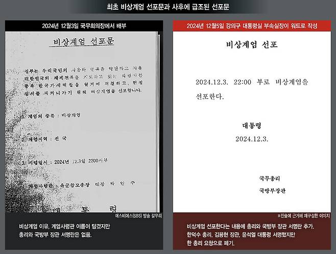 지난해 12월3일 작성·배포된 비상계엄 선포문과 이틀 뒤 재작성된 사후 선포문은 내용과 양식이 크게 다른 것으로 확인됐다.