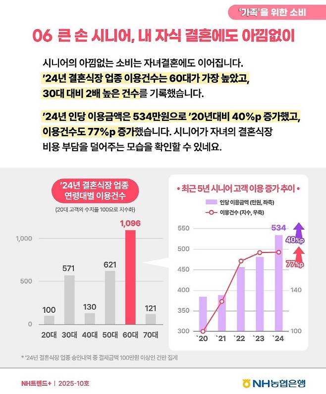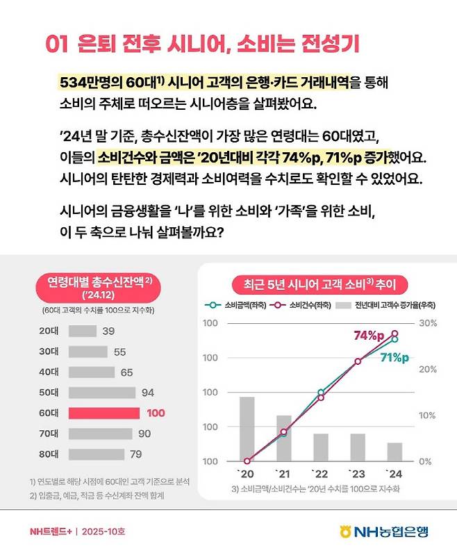 5일 NH농협은행의 ‘NH트렌드+ 쓸 줄 아는 시니어, 나와 가족을 위한 이유있는 소비’ 보고서에 따르면 60대 시니어 고객의 소비건수는 지난 5년 새 74%, 소비금액은 71% 증가했다. 농협은행이 지난 2020년부터 2024년까지 60대 고객 534만명의 28억건 결제 데이터를 분석한 결과다.