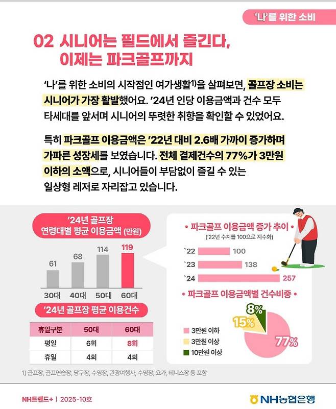 60대 소비자들은 스스로를 위해서 돈을 쓰고 있었다. 지난해 골프장 평균 이용금액을 연령대별로 비교해보면 60대가 연간 119만원을 지출해 20~50대를 제치고 가장 소비금액이 많았다. 30대의 지난해 평균 소비금액(61만원)의 2배 수준이다. 60대는 평일 8회, 주말 4회 골프장을 이용하는 것으로 집계됐다. 50대(평일 6회, 휴일 4회)에 비해서도 평균 이용건수가 많다. 특히 지난해 파크골프 이용금액은 2022년에 비해 2.6배 가까이 늘었다. 농협은행 관계자는 “골프장 소비는 시니어가 가장 활발했다. 인당 이용금액과 건수 모두 타세대를 앞서며 시니어의 뚜렷한 취향을 알 수 있었다”며 “시니어들이 부담없이 즐길 수 있는 일상형 레저로 자리잡고 있다”고 분석했다.