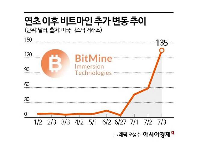 비트마인의 주가는 지난 3일(현지시간) 전장대비 130.77% 오른 135달러를 기록했다. 지난달 27일 4.26달러였던 비트마인의 주가는 불과 5거래일만에 3069% 급등했다. 연초 7달러로 시작해 지지부진한 흐름을 보이다가 최근 이더리움 매입에 나서겠다고 발표한 이후 급등세가 나타났다.