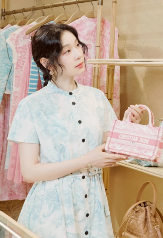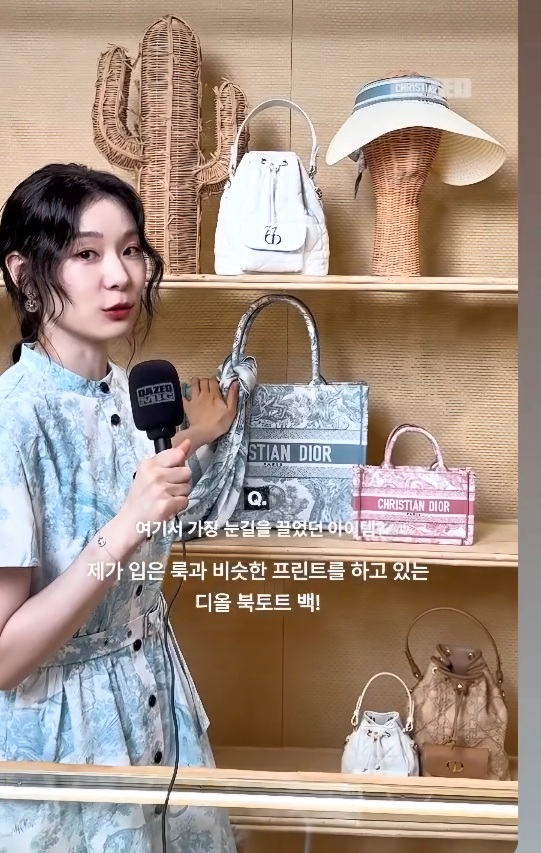 영상 속 김연아는 브랜드 마이크를 들고, 자신이 입은 민트 계열의 프린트 원피스와 거의 동일한 패턴의 디올 북토트 백을 소개했다.