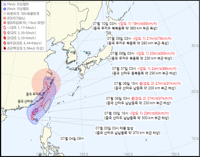 기상청에 따르면 오늘(3일) 새벽 3시 중국 산터우 남남동쪽 약 370㎞ 해상에서 발생한 제4호 태풍 '다나스'는 시속 14㎞의 속도로 북상 중입니다.