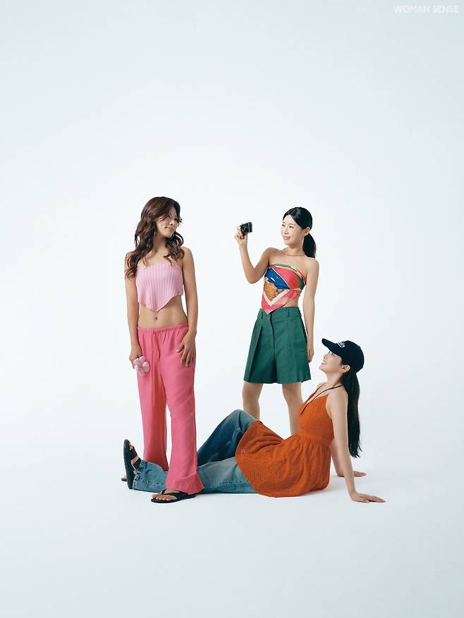 이새암 핫 핑크 리넨 와이드 팬츠 2만9천9백원 H&M, 블랙 레더 플립플롭 30만원 마이클코어스, 트라이앵글 핑크 니트 톱 스타일리스트 소장품 신주영 그린 버뮤다팬츠 59만8천원 위크엔드 막스마라, 톱으로 연출한 컬러 실크 스카프 스타일리스트 소장품 최예진 레드 슬리브리스 톱 4만9천9백원 H&M, 워싱 데님 팬츠 15만원 코스, 네이비 볼캡 4만9천원 포에트서울, 블랙 샌들 19만원 닥터마틴