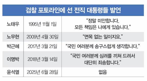 박근혜 전 대통령은 2017년 3월 21일 서울중앙지검에 출석했다. 헌법재판소에서 파면이 결정된 지 11일 만이다. 뇌물수수 및 직권남용 권리 행사 방해, 업무상 기밀 누설 등 총 14개 혐의를 받고 있는 상태였다. 취재진이 "검찰 수사가 불공정하다고 생각하느냐"고 묻자 박 전 대통령은 담담하게 "국민 여러분께 송구스럽게 생각한다. 성실하게 조사에 임하겠다"고 말한 뒤 청사로 들어가 21시간 동안 조사를 받았다. 박 전 대통령은 2016년 이른바 '최순실 게이트'가 터지자 세 차례 대국민 담화를 통해 사과한 바 있다.이명박 전 대통령도 2018년 3월 14일, 퇴임 후 5년 만에 서울중앙지검 앞 포토라인에 섰다. 횡령 및 뇌물 혐의를 받은 그는 이날 1분여에 걸쳐 약 300자 분량으로 심경을 토로했다. "참담한 심정으로 이 자리에 섰다"며 "무엇보다도 민생경제가 어렵고 한반도를 둘러싼 안보 환경이 매우 엄중한 때에 나와 관련된 일로 국민 여러분께 심려를 끼쳐 드려서 대단히 죄송하다"고 말한 것이다. 이후 당시 수사를 총괄한 한동훈 서울지검 3차장검사와 티타임을 가진 이 전 대통령은 피의자 신문 조서 확인을 포함해 총 21시간 동안 조사를 받았다.