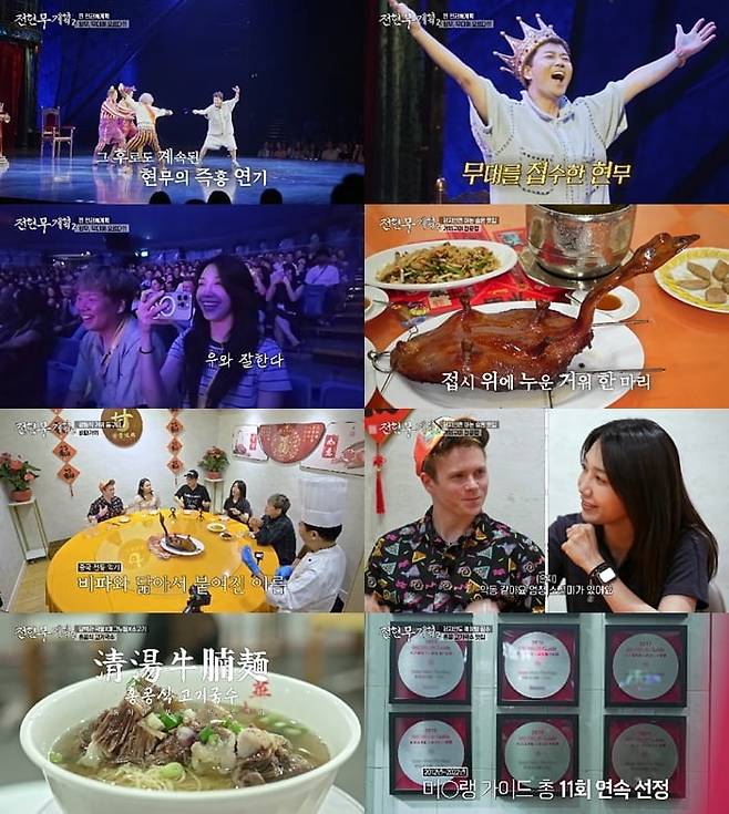 이날 ‘홍콩 원정대’ 전현무, 곽튜브, 정은지는 “우리가 드디어 ‘태양의 서커스’를 본다”며 발걸음을 재촉했다. 직후 백스테이지에서 자신들을 초대해준 배우들을 만난 세 사람은 ‘한국 간식’을 선물해 화기애애한 분위기를 형성했다. 뒤이어 세 사람은 서커스를 관람했는데, 공연 중 배우들이 갑자기 관객석으로 내려와 전현무를 무대 위로 이끄는 돌발 상황이 벌어졌다. 전현무는 갑작스런 공연 참여에도 강도 높은 ‘광대 춤’을 선보였다. ‘한국 연예대상’의 명예를 건 그의 ‘웃음 투혼’에 서커스 관람객들도 포복절도하며 박수를 보냈다.