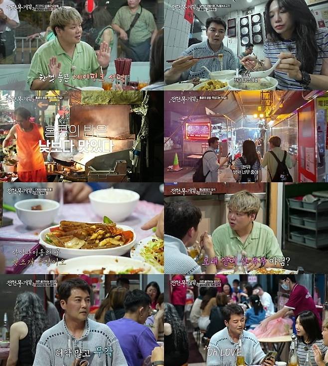 만족스런 첫 끼를 마친 뒤, 전현무는 “홍콩은 밤이지! 야장, 포차 느낌을 즐겨보자”며 ‘홍콩의 힙지로(HIP+을지로)’로 불리는 삼수이포로 향했다. 예스런 감성이 심장을 뛰게 하는 삼수이포의 야장들 중, 세 사람은 유난히 붐비는 다이파이동에 자리를 잡았다. 그런 뒤, 요리사의 ‘불쇼’급 요리 모습을 관전한 세 사람은 시그니처 메뉴인 ‘소고기 감자볶음’부터 전현무 픽 ‘맛조개 볶음’ 등 다양한 메뉴를 주문했다. 맥주까지 페어링 해 ‘홍콩의 밤 요리’를 즐기던 중, 전현무는 취기가 살짝 오른 듯 숟가락을 떨어뜨렸다. 그러자 정은지는 “이 오빠 취했네~”라며 사투리로 면박을 줬고, 전현무도 사투리로 맞받아쳤다. 두 사람의 구수한 케미에 곽튜브는 “오래 된 부부 보는 느낌”이라고 표현했는데, 정은지는 곧장 눈으로 욕을 해 웃음을 안겼다.