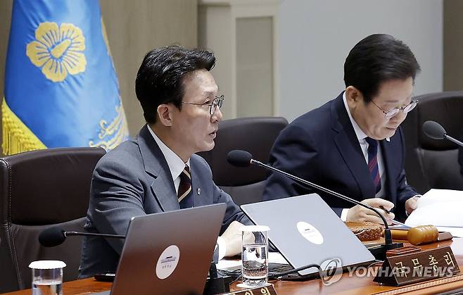 (서울=연합뉴스) 홍해인 기자 = 김민석 국무총리가 5일 서울 용산 대통령실 청사에서 열린 국무회의에 참석해 발언하고 있다. 2025.7.5 [대통령실통신사진기자단]