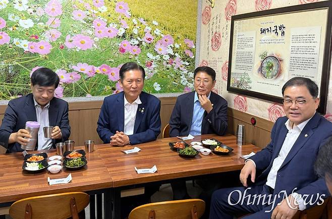 정 의원은 5일 아침 창원시 성산구 사파동 대동상가 지하에 있는 국밥집에서 '동부경남 핵심당원 조찬 간담회'를 가졌다. 이 자리에는 허성무(창원성산), 이성윤(전주을), 김영환(고양정) 국회의원이 함께했다.
