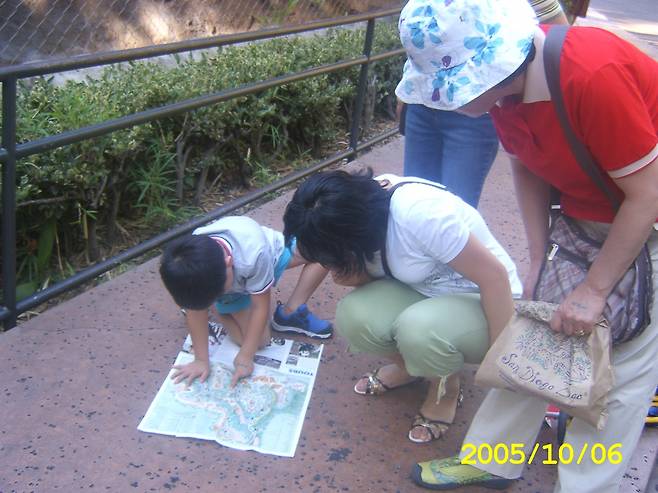 | ▲ 길을 찾는 것이 여행 큰아들이 다섯 살 때 샌디에고 동물원에서 지도를 펼치고 길을 찾고 있다. |