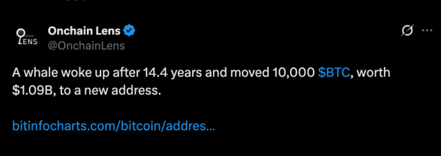 한 고래 투자자가 14년간 휴면 상태에 있던 비트코인 1만 개를 새로운 주소로 이전한 것이다.