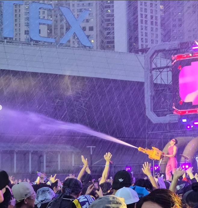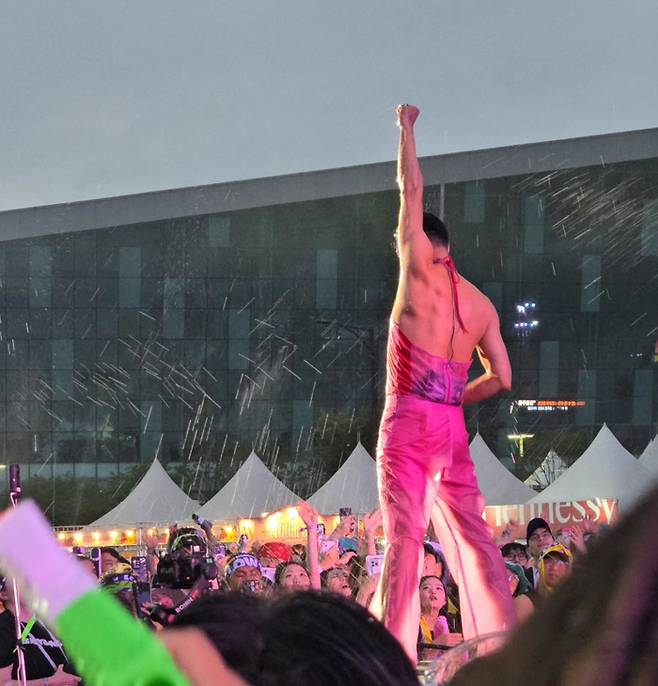 4일 경기도 고양시 킨텍스 야외 글로벌 스테이지에서 열린 ‘워터밤 서울 2025’에 첫 출연한 박진영은 핑크색 시스루 홀터넥과 비닐 바지라는 파격적인 의상으로 등장해 현장을 뜨겁게 달궜다. 등장과 동시에 관객들의 우레와 같은 환호가 쏟아졌으며, 박진영은 특유의 에너지 넘치는 무대 매너로 분위기를 압도했다.