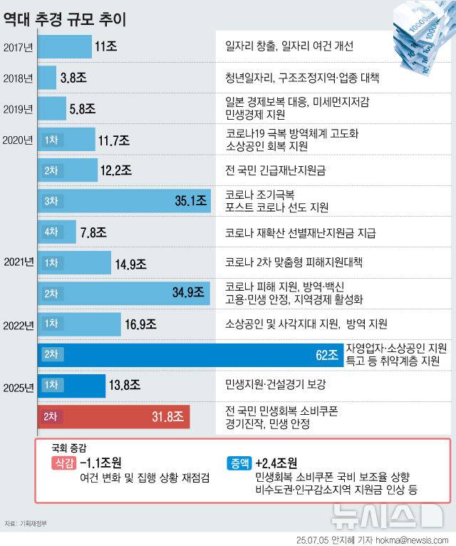 [서울=뉴시스] 이재명 정부 첫 추가경정예산(추경)이자 올해 두 번째 추경안이 지난 4일 국회 본회의를 통과했다. 추경 규모는 당초 정부안 대비 약 1조2400억원이 증액된 31조7914억원이다. 핵심 사업인 민생회복 소비쿠폰 예산 총액은 국비 지원율 등을 조정해 정부안 보다 1조8742억원 증액됐다. 또 영유아 보육료 지원 사업 예산이 1131억원 증액됐고, 대통령비서실·법무부·감사원·경찰청 등 4개 기관에 대한 특수활동비가 총 105억원 증액됐다 (그래픽=안지혜 기자)