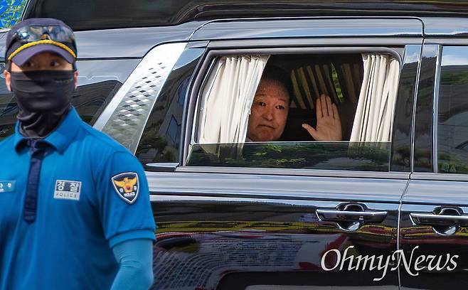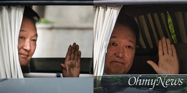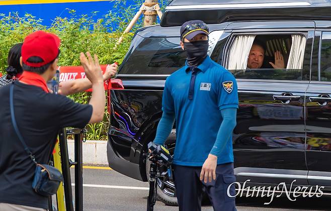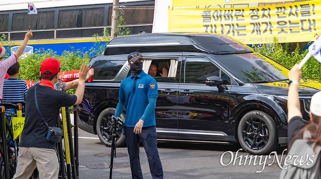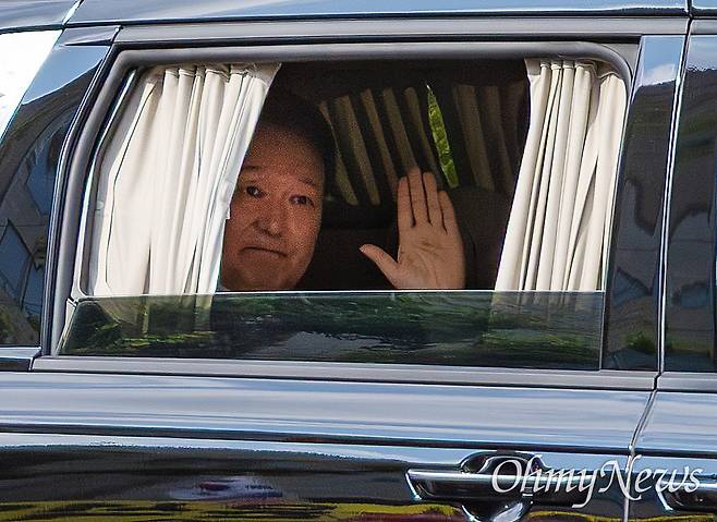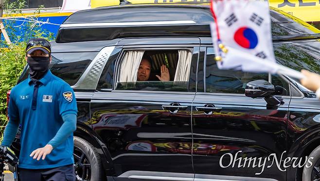 내란특검 사무실이 입주한 서울 서초동 서울고검으로 향하던 윤석열 전 대통령이 검찰청앞에서 "윤 어게인" "대통령 윤석열"을 외치는 지지자들을 향해 손을 흔들고 있다. 그동안 법정 출석과 특검 소환때 지지자들을 향해 여유있어 보이려는 듯 엷은 미소를 지었으나, 이날은 '슬퍼보이는 표정'을 하고 있다.