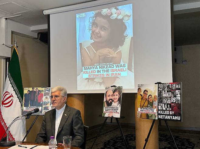 지난달 30일 사이드 쿠제치 주한 이란대사가 주한 이란대사관에서 열린 기자 간담회에서 이스라엘의 공습 때 희생된 어린이의 사진을 보여주며 미국과 이스라엘을 비난하고 있습니다.