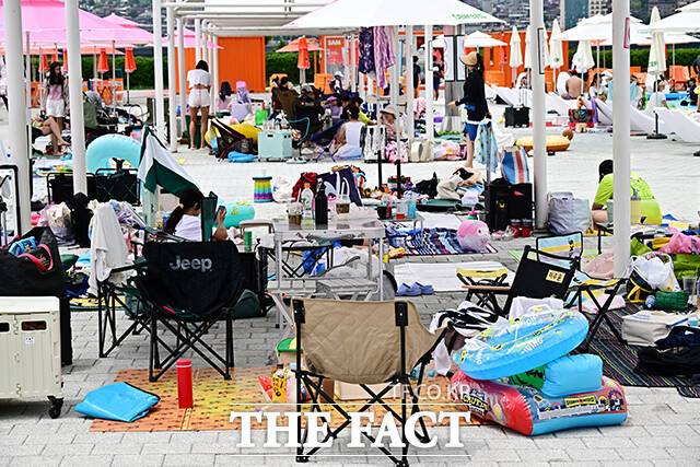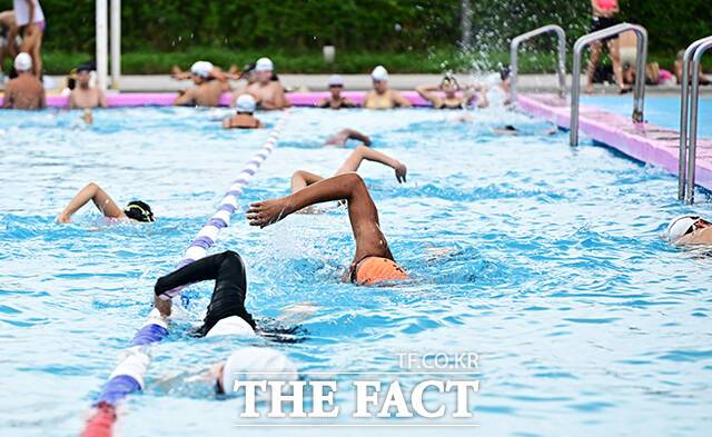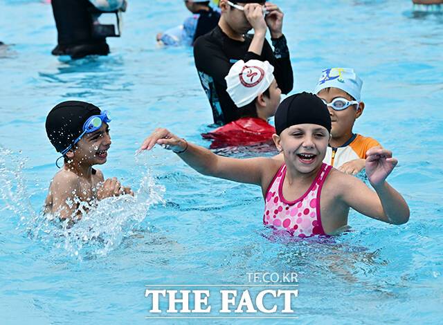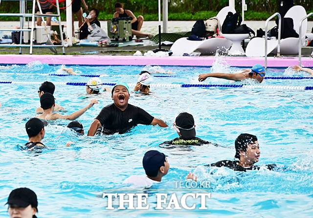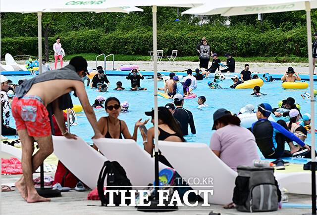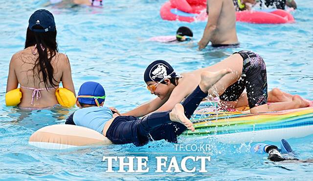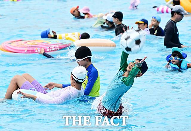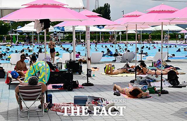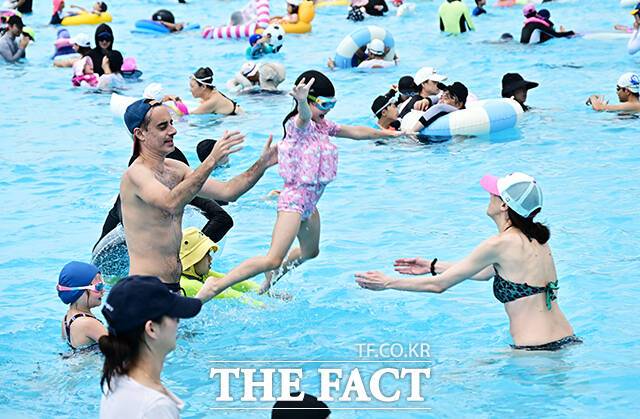 [더팩트ㅣ배정한 기자] 전국에 폭염특보가 발효된 5일 오후 서울 서초구 잠원 한강지구 야외수영장에서 시민들이 물놀이를 하며 무더위를 식히고 있다.