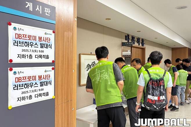 원주 DB프로미 선수단과 DB손해보험 임직원들이 5일 강원특별자치도 원주시에서 '프로미 농구단과 함께하는 러브하우스'를 위해 모였다.