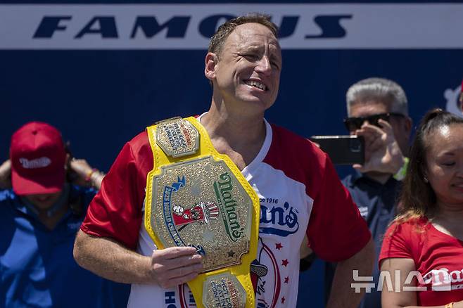 [뉴욕=AP/뉴시스] 4일(현지 시간) 미국 뉴욕 브루클린의 코니아일랜드에서 열린 2025 네이선스 핫도그 먹기 대회 남자부 우승자 '조스' 조이 체스트넛(미국)이 챔피언 벨트를 들고 기뻐하고 있다. 체스트넛은 10분 만에 70.5개를 먹어 46.5개를 먹은 지난해 우승자 패트릭 버톨레티를 크게 제치고 챔피언 벨트를 되찾았다. '조스'는 지금까지 17회 우승했으며 76개를 먹어 치운 최고 기록 보유자이기도 하다. 2025.07.05.