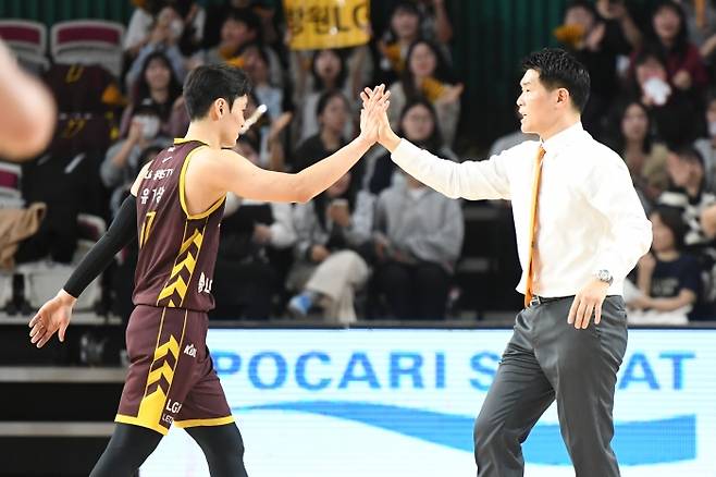 <사진> 조상현 감독이 경기 도중 유기상과 하이 파이브를 하고 있다. KBL 제공