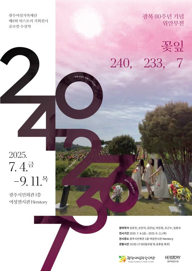 광주여성가족재단은 오는 9월 11일까지 광주여성전시관 Herstory에서 일본군 ‘위안부’ 피해자들을 기억하는 기획 전시 ‘꽃잎-240, 233, 7’을 선보인다. 광복 80주년을 기념해 전쟁 피해자의 역사적 고통과 삶의 의미를 예술로 기억하기 위한 자리다.