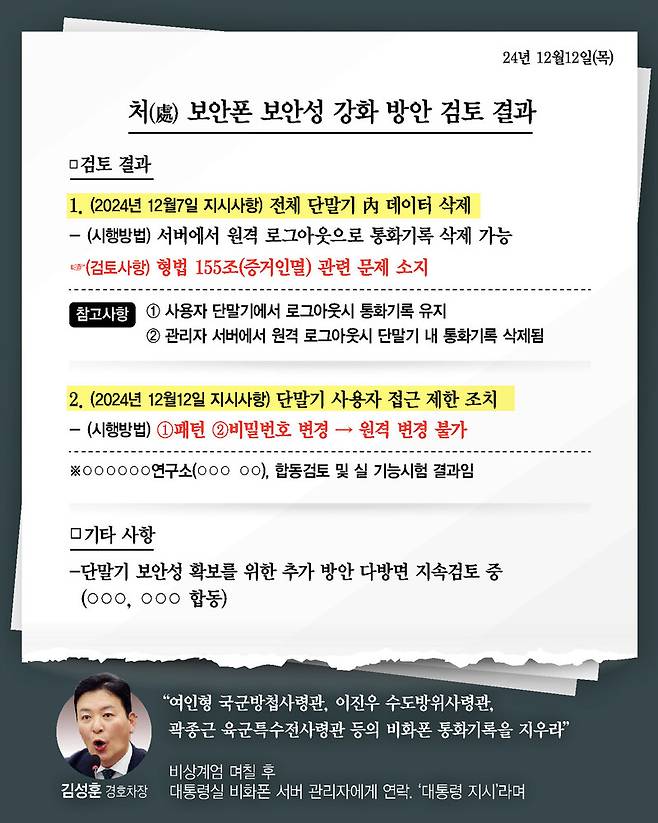 이에 경호처 직원들은 지난해 12월12일 ‘처(處) 보안폰 보안성 강화 방안 검토 결과’라는 제목의 문건을 만들어 전 김 차장에게 보고했다. 문건에는 김 전 차장이 지난해 12월7일 “전체 단말기 내 데이터 삭제”를 지시했다는 내용이 담겼고 ‘검토사항’으로 “형법 155조(증거인멸) 관련 문제 소지”라고 기록했다. 김 전 차장의 지시가 증거인멸에 해당할 수 있다는 뜻이다. 김 전 차장이 위법한 지시를 거듭하자 공식 보고 문건을 만들어 거부 이유를 명시한 것으로 보인다. 이에 대해 김 전 차장은 경찰 조사에서 지난해 12월6일 홍장원 국정원 전 1차장의 비화폰 화면이 국회에서 공개된 바 있어 실제 보안강화가 필요해 이런 지시를 내렸다고 주장해왔다. 윤 전 대통령 쪽은 비화폰 삭제 지시를 내린 바 없다는 입장이다. 하지만 특검팀은 이날 경찰 수사 단계에서 확보한 경호처 직원의 진술 등을 바탕으로 윤 전 대통령을 추궁할 것으로 보인다.