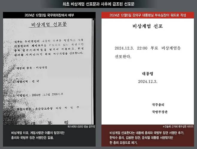하지만 검찰은 강 전 실장 진술의 신빙성을 의심하며 “국무총리 서명을 받는 문제인데 대통령의 지시도 없이 국무총리에게 서명을 요구하였다는 것은 납득이 되지 않는다” “민정수석이나 민정수석실에서 검토한 뒤 진술인에게 서명을 받으라고 시킨 것은 아닌가” 등을 물었다. 특검팀 역시 강 전 실장의 진술이 사실이 아니라고 보고 이날 김 전 수석을 소환해 사후 계엄선포문 작성에 윤 전 대통령과 김 전 수석이 관여했는지 등을 추궁한 것으로 알려졌다.
