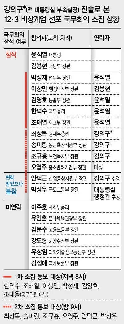 국무위원들은 세 부류로 나뉜다. 전체 20명의 국무위원 중 비상계엄을 주도한 윤 전 대통령과 김용현 전 국방부 장관을 제외한 9명은 대통령실 연락을 받고 국무회의에 참석했다. 2명은 연락을 받았지만 늦게 도착해 국무회의에 참석하지 못했다. 6명은 연락조차 받지 못했다.