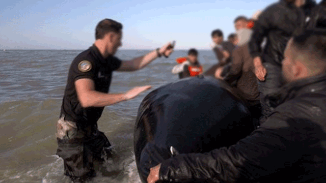 칼에 찔려 공기가 빠진 고무보트는 급격히 가라앉았고, 그 위에 타고 있던 이주민 수십 명은 보트에서 내려 해변으로 걸어 나올 수밖에 없었습니다.