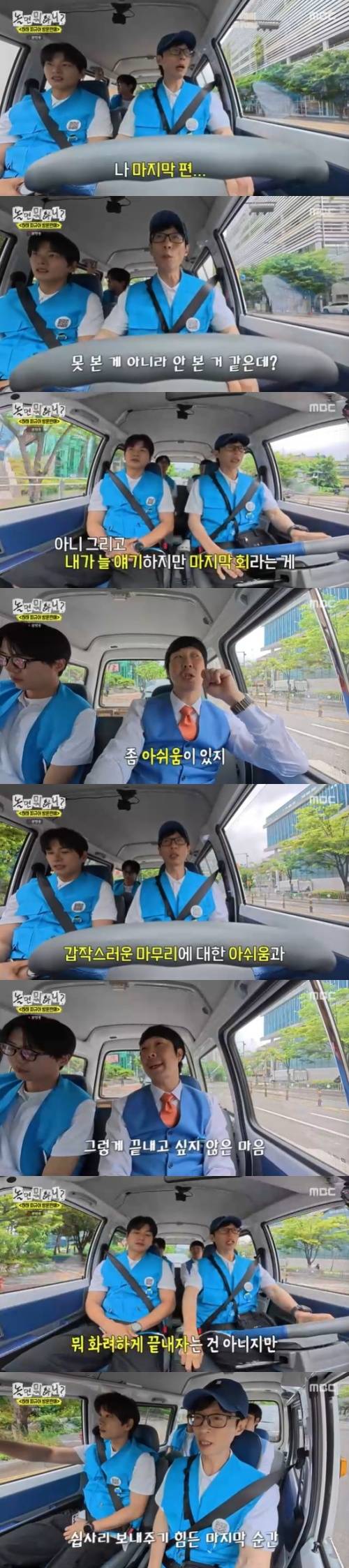 이에 유재석은 "아 그렇지. 화려하게 끝내자는 건 아니지만, 이게 마지막회는 아닌 거 같다는 생각을 했다. 어쨌든 마무리는 해야되는 회차니까, 마지막 회보단 마무리 회차 느낌"이라고 했다.