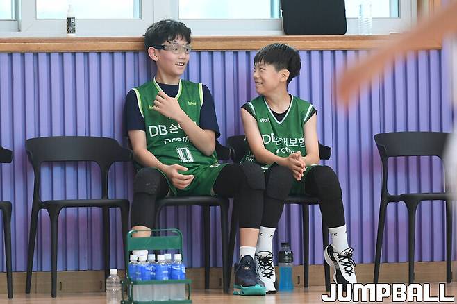[점프볼=청주/박상혁 기자] 5일 충북 청주에 위치한 내수생활체육공원 다목적체육관에서 열린 '2025 i2 충북청주농구 아이리그 U12부 경기, 원주DB 선수들이 벤치에서 미소를 지으며 대화를 나누고 있다.