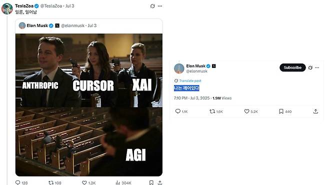머스크는 현지 시각 3일 자신의 엑스(X) 계정에 인공지능 경쟁구도를 풍자한 사진을 올렸습니다.