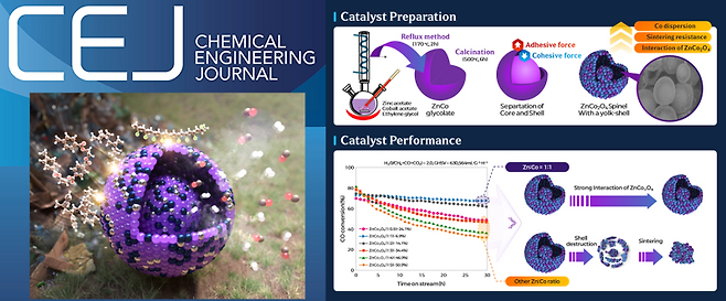 연구팀은 폐기물 가스화 과정에서 생성된 고농도 일산화탄소(CO)를 수소(H₂)로 전환하는 Zn–Co 기반 스피넬 촉매(ZnCo₂O₄)를 개발하는 과정에서 내부 핵(core)과 외부 껍질(shell) 사이에 빈 공간이 존재하는 ‘요크-쉘(yolk-shell)’ 구조를 도입했다. 이 구조는 고온에서도 금속 응집과 구조 붕괴를 효과적으로 억제해 장시간 안정적인 수소 전환 반응을 가능케 한다.