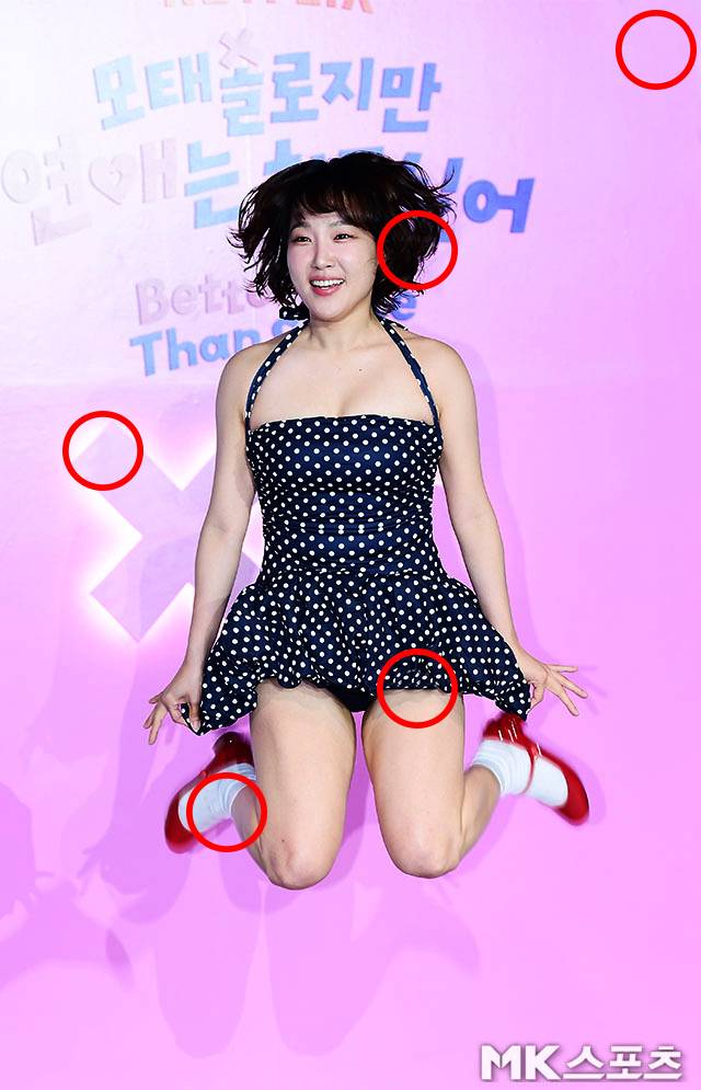 이날 현장에서 이은지는 도트 수영복 스타일 원피스에 하얀 양말과 빨간 메리제인 힐을 매치한 패션으로 무대에 올라 속바지가 보일 정도로 아찔한 점프 퍼포먼스를 선보였습니다.