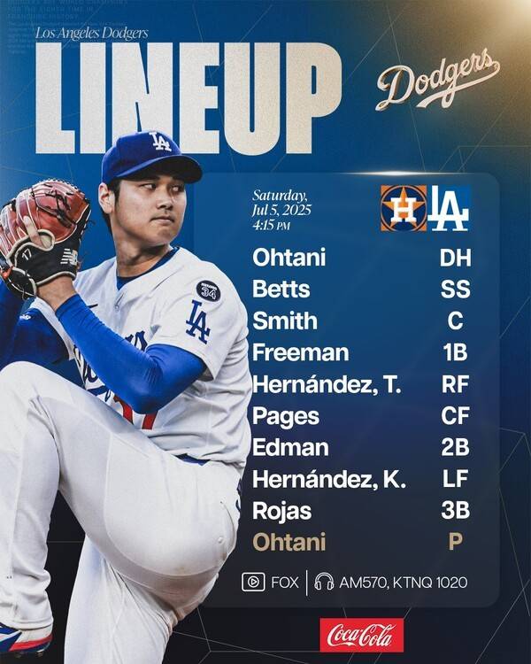 다저스는 오타니 쇼헤이(투수 겸 지명타자)-무키 베츠(유격수)-윌 스미스(포수)-프레디 프리먼(1루수)-테오스카 에르난데스(우익수)-앤디 파헤스(중견수)-토미 에드먼(2루수)-키케 에르난데스(좌익수)-미겔 로하스(3루수)으로 타순을 꾸렸다.