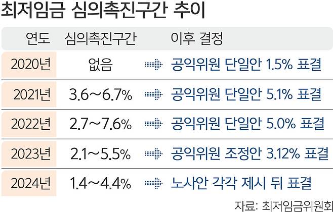 심의촉진구간은 노사 간 이견이 좁혀지지 않을 때 공익위원들이 내놓는 최저임금 상·하한선이다.