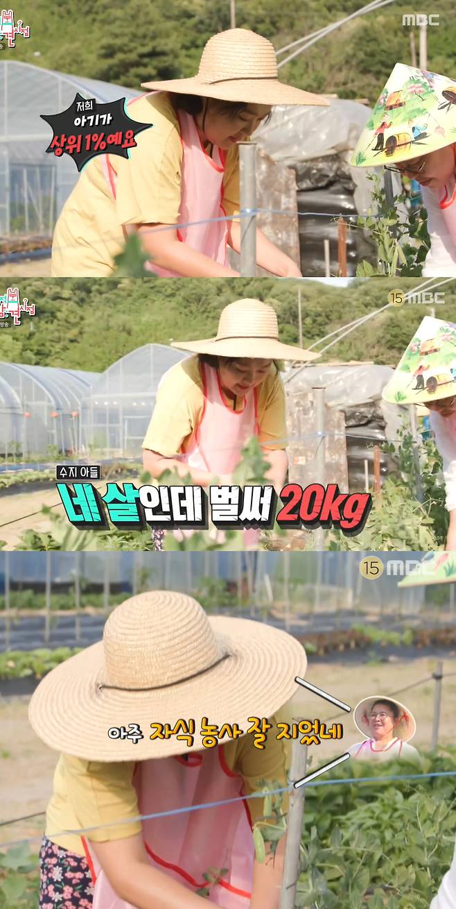 이영자는 "아들에게 완두콩을 먹이라"며 완두콩 수확에 이수지를 투입했고 이수지는 "저희 아들이 상위 1%"라고 자랑스러워했다.
