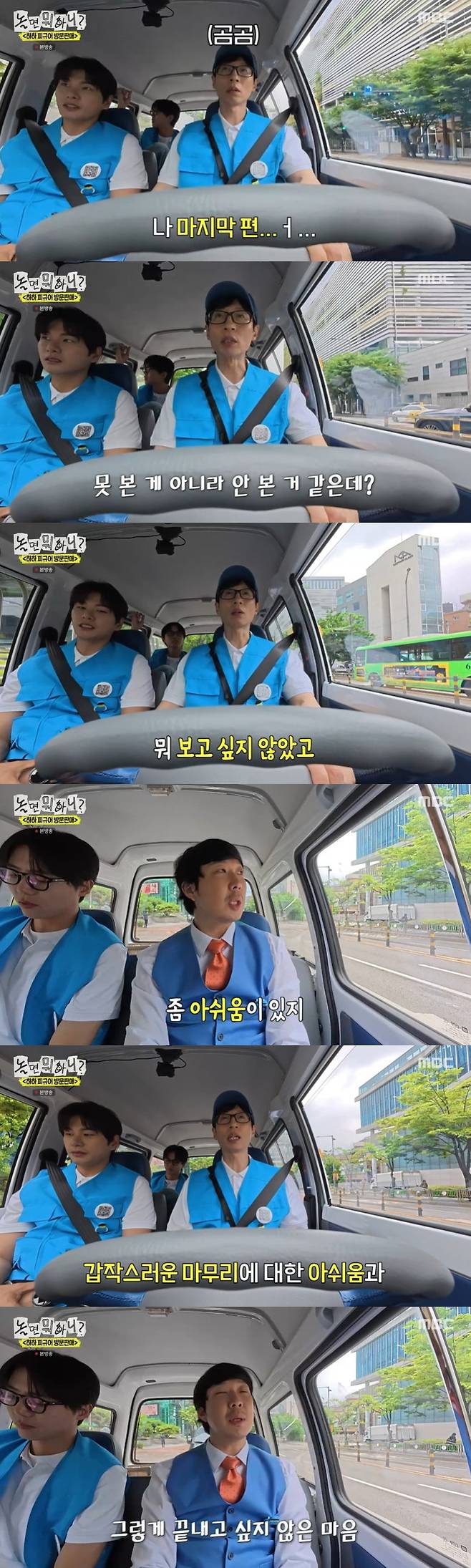 "마지막 편..."이라며 잠깐 생각에 잠긴 유재석은 "못 본 게 아니라 안 본 것 같다. 별로 그렇게 보고 싶지 않았고, 내가 늘 얘기하지만 마지막 회라는 게 갑작스러운 마무리에 대한 아쉬움과 화려하게 끝내자는 건 아니지만 '이게 마지막 회는 아닌 거 같다'는 생각"이라고 밝혔다.