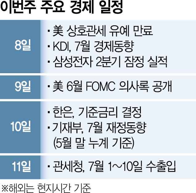 이번 주에는 한국은행의 기준금리와 삼성전자 2분기 실적 등 다양한 지표가 발표된다. 미국 도널드 트럼프 행정부의 상호관세 유예기간 연장이 8일 만료되는 가운데 우리나라가 어떤 결과지를 통보받을지도 관심사다.