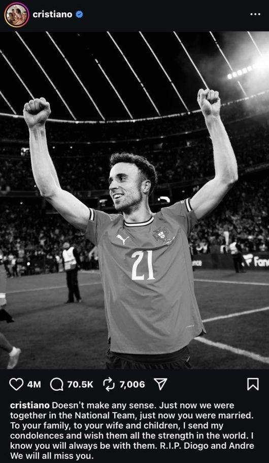 호날두 역시 소셜 미디어를 통해 "말도 안 된다. 우리는 방금 전까지 국가대표팀에서 함께 있었고, 너는 이제 막 결혼했다. 너의 가족과 아내, 자녀들에게 애도를 표한다. 세상의 모든 힘이 그들에게 닿기를 바란다. 네가 항상 그들과 함께할 거라는 사실을 알고 있다. 디오구와 안드레, 편히 쉬기를(R.I.P). 우리 모두 당신을 그리워할 것"이라며 슬퍼했다.