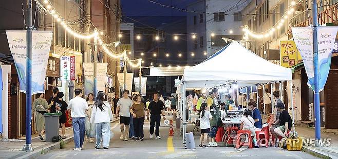 (동해=연합뉴스) 지난 5일 개장한 전통시장인 강원 동해시 동쪽바다중앙시장의 주말 야시장이 손님들로 북적이고 있다.