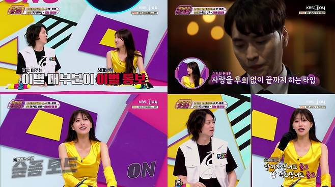 비비의 ‘하늘 땅 별 땅(1997)’이 7위에 자리했다. 이 곡은 여성이 상대의 취향에 다 맞췄지만, 결국 상대가 다른 사람을 선택하는 내용의 가사를 담고 있다. 방송에서는 유사한 주제를 다룬 브라운 아이드 걸스의 ‘어쩌다’, 다비치의 ‘사랑과 전쟁’도 함께 언급됐다. 김희철이 “보통 헤어지면 나이트클럽 가지 않냐”고 묻자, 이미주는 “난 헤어지면 양치하면서도 울고 밥 먹으면서도 운다”며 “눈물이 계속 난다”고 답했다.