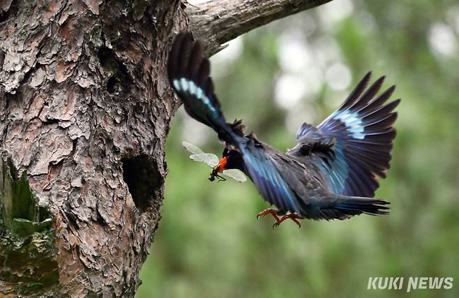 폭염이 연일 전국을 맹타하는 가운데 지난 3일 강원 홍천군 동면 한 계곡 입구 소나무에 둥지를 튼 파랑새가 새끼를 위해 먹이를 물어 나르고 있다.
