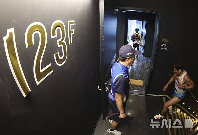 철인 3종 경기에서 사이클론을 제외한 오픈워터 수영과 마라톤을 함께 겨루는 '2025 롯데 아쿠아슬론'은 석촌호수 두 바퀴(총 1.5Km)를 완영 후, 롯데월드타워 1층부터 123층까지 2,917개의 계단을 오르는 수직 마라톤 스카이런(SKY RUN)으로 진행됐다. 2025.07.06. ks@newsis.com