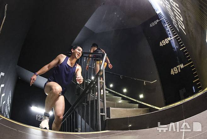 철인 3종 경기에서 사이클론을 제외한 오픈워터 수영과 마라톤을 함께 겨루는 '2025 롯데 아쿠아슬론'은 석촌호수 두 바퀴(총 1.5Km)를 완영 후, 롯데월드타워 1층부터 123층까지 2,917개의 계단을 오르는 수직 마라톤 스카이런(SKY RUN)으로 진행됐다. 2025.07.06. ks@newsis.com